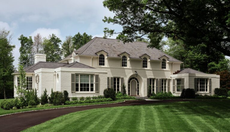 This new construction home for empty-nester clients blends timeless tradition with modern finishes. Inspired by 1920s precedents, the exterior features painted brick parapets, engaged dormers, and detailed masonry with jack arches, dentils, and belt courses, while the interior showcases custom casings, baseboards, and limestone mantels with Art Deco motifs. A dramatic bridge overlooking the family room is suspended from steel rods, balancing scale and adding interest. Central to the design, a grand oak tree provides shade and a sense of permanence. Carefully selected materials, thoughtful detailing, and historical inspiration create a home that feels both established and contemporary.